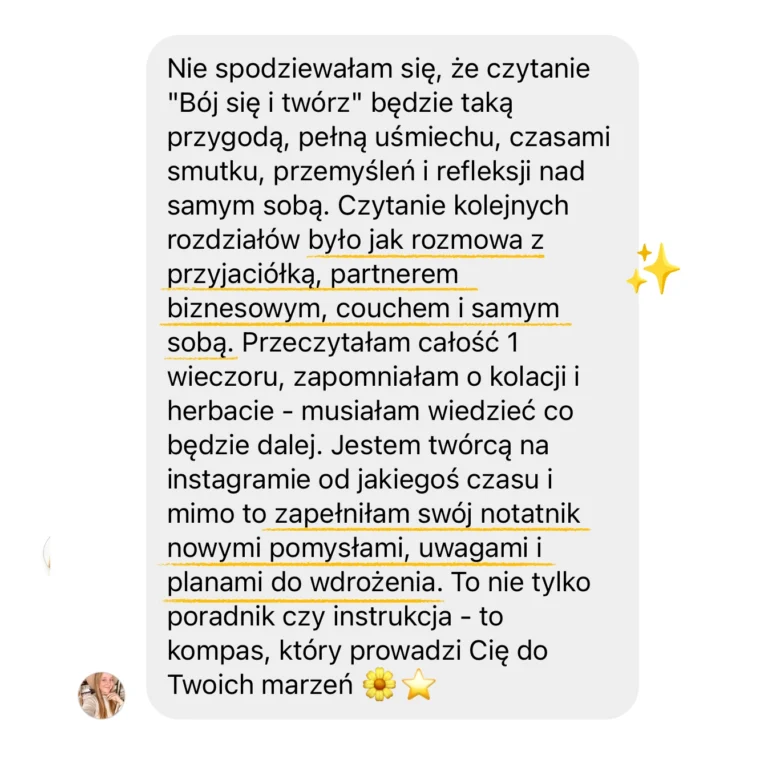 Od 8 lat jestem na ścieżce samorozwoju, dzięki temu jestem bardziej świadomą twórczynią i przedsiębiorczynią